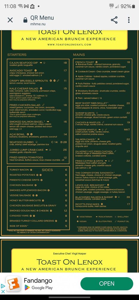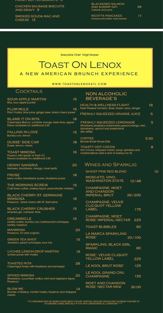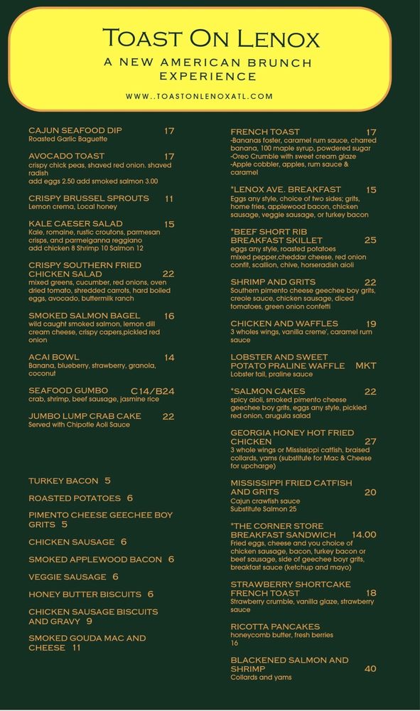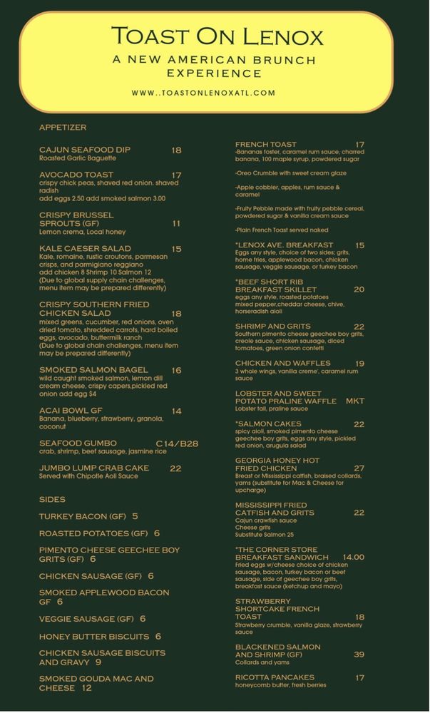 Toast on Lenox, located in Atlanta, offers a trendy, casual atmosphere with a diverse menu catering to various dietary preferences. The restaurant provides a range of services, including reservations, takeout, and delivery, along with vegan options and wheelchair accessibility. The extensive menu features flavorful dishes like the Seafood Gumbo, Smoked Salmon Bagel, and Beef Short Ribs Breakfast Skillet. Customers rave about the Avocado Toast, Crispy Southern Fried Chicken Salad, and Pimento Cheese Grits as must-try items. The restaurant's commitment to sustainability is evident through its use of compostable containers and plastic-free packaging. Overall, Toast on Lenox is a vibrant spot for breakfast, brunch, or lunch, with a friendly staff and delicious food that will leave you satisfied.